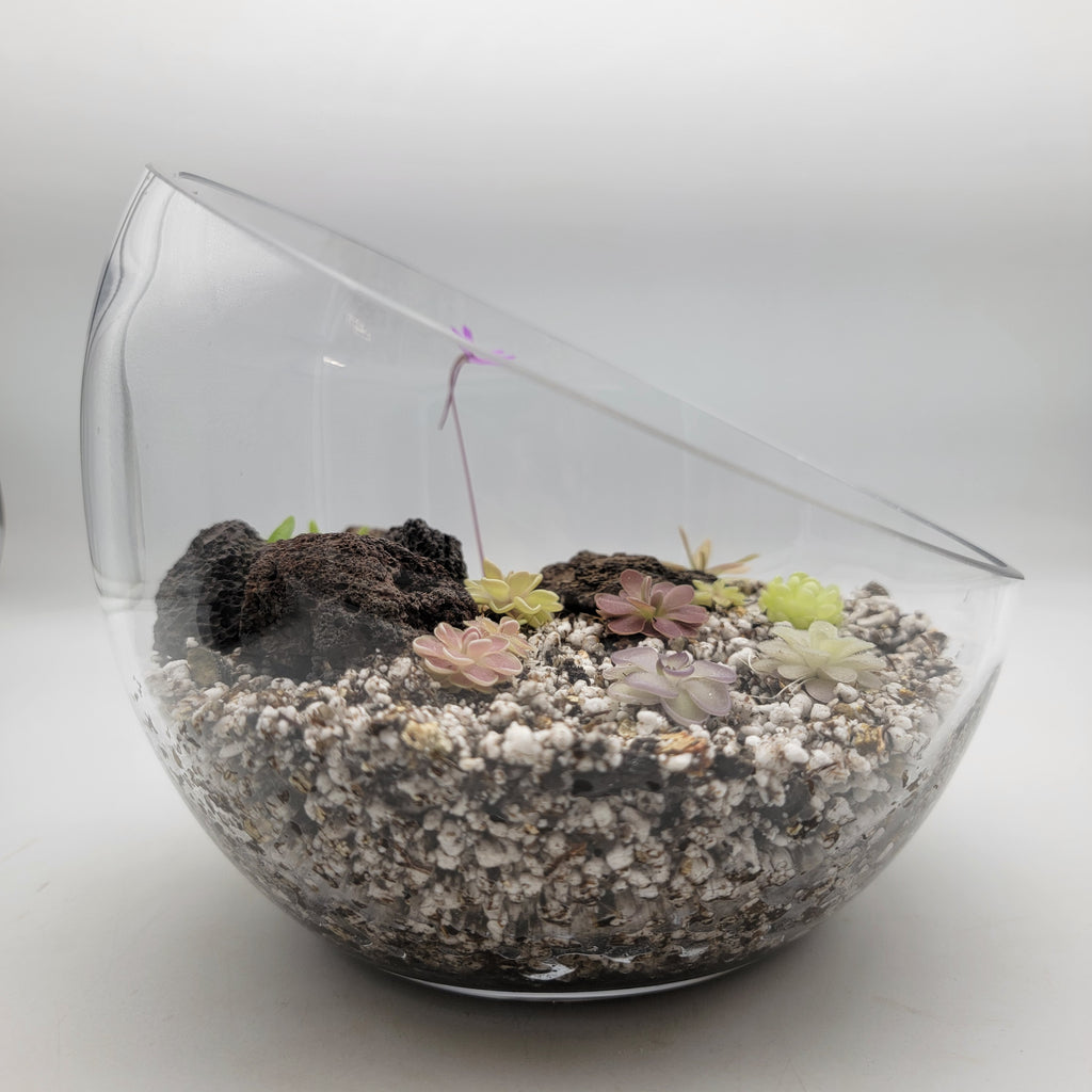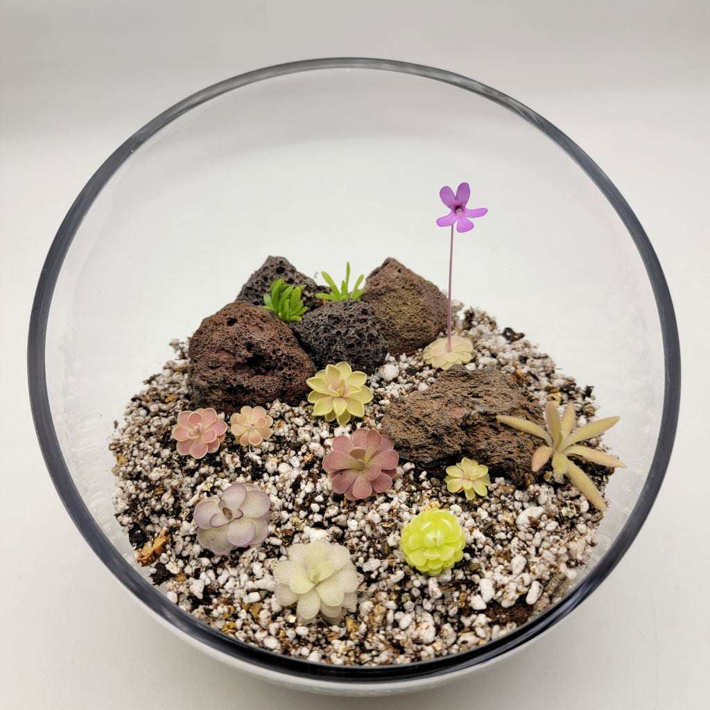 In this kit you'll get a 6.75" crystal terrarium, soil mix, some small lave rocks (3-5 pieces), and SMALL Butterworts randomly selected. Make sure you select the right ping's quantity option. We have three options: